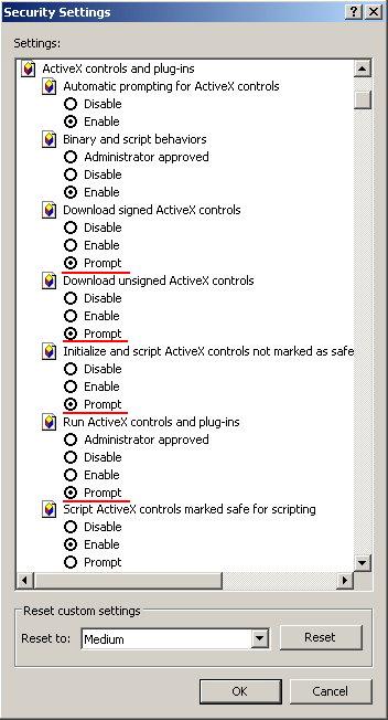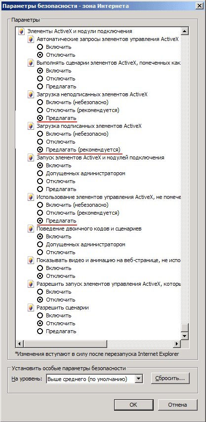 Для корректной работы браузера рекомендуем изменить параметры секции "Элементы ActiveX и модули подключения" ("ActiveX controls and plug-ins") в свойствах IE раздела "Параметры безопасности" ("Security Settings") в соответствии с представленными скриншотами: